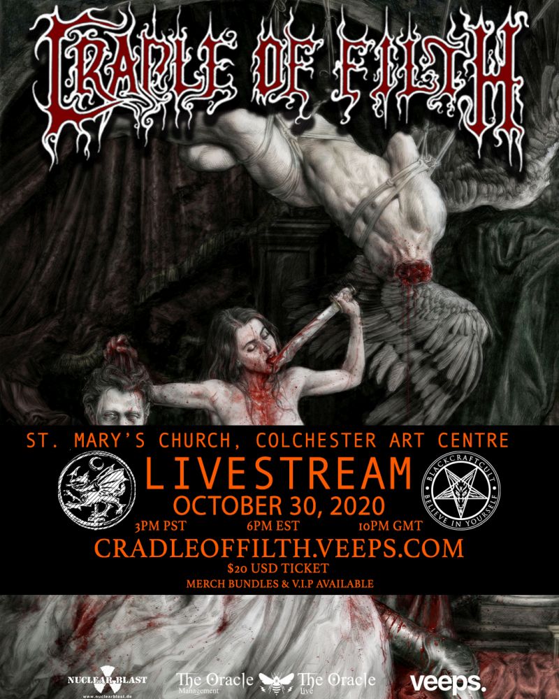 Despite the extremely difficult situation for musicians and concerts all over the world, Vampyric Masters of Extreme Metal, CRADLE OF FILTH, continue to appease their salivating fans by celebrating All Hallow’s Eve in style, even in 2020, the official year of the plague. This time the band, draped around lead singer Dani Filth, take it to the next far-flung tower by announcing a live stream concert from St. Mary’s Church, Colchester Art Centre, England for the auspicious date of October, 30th.