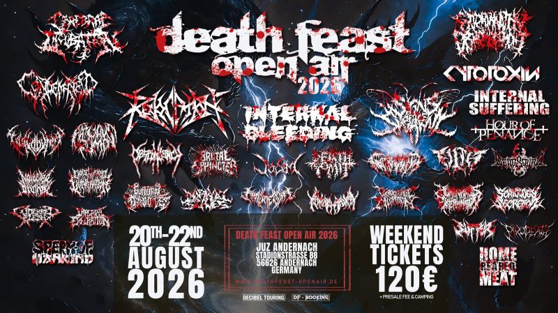 One of Europe’s most dedicated underground death metal festivals is back – and bigger than ever. DEATHFEAST OPEN AIR 2026 will take place from August 20-22, 2026 at JUZ Andernach, Germany, bringing together 33 bands from 18 countries for three days of uncompromising brutality.