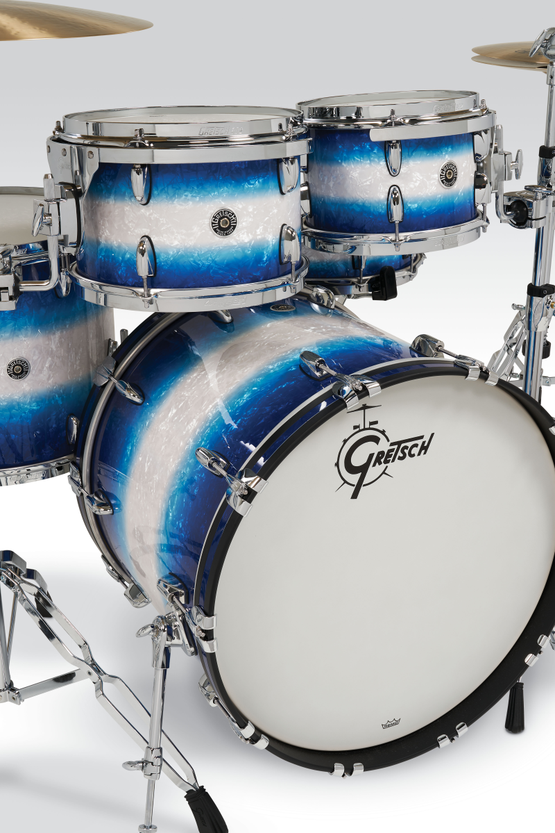 Gretsch Drums introduce two new Nitron finishes to their Brooklyn series; Blue Burst Pearl for the original kit and White Marine Pearl for the Micro Kit.