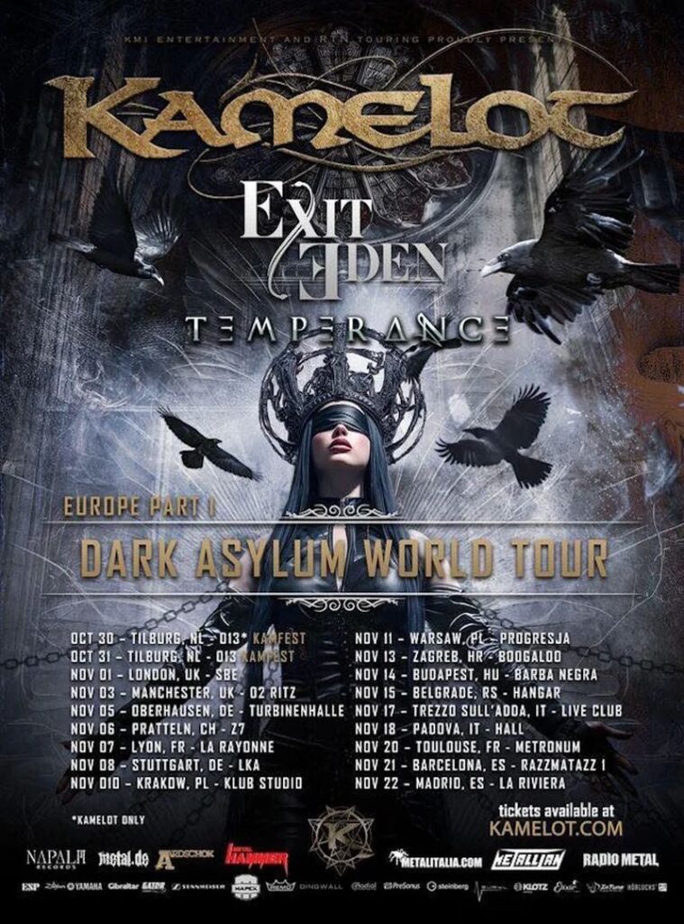 Next, the band will head out on a European headline tour, featuring very special guests EXIT EDEN and support artist TEMPERANCE. The tour will deliver KAMELOT‘s trademark brand of cinematic, top-charting melodic metal to 18 venues across Europe, culminating on November 22 in Madrid. European headline tour tickets are available for purchase now.