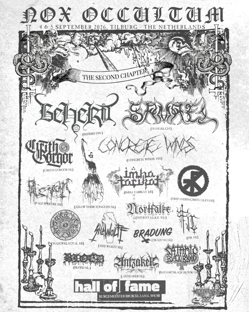 NOX OCCULTUM is all about intense, uncompromising, immersive music, ascending from cult, underground and new rising artists in the extreme metal genre. The first chapter in 2025 included performances by Tormentor, Misotheist, Ultra Silvam, Necromaniac, Bad Omen, Necrowretch, Saturnalia Temple and more. Following in the path of the first chapter, this carefully curated gathering will once again take place at the Hall of Fame in Tilburg, the Netherlands, on September 4 & 5, 2026.