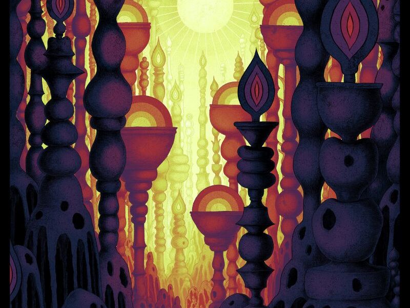 [WALTER] Nee, nee, nee. Ik heb gevraagd of hij een drieluik wilde maken: één paneel past, één paneel present Roadburn, één paneel future Roadburn. Daarin heeft hij verder de vrije hand gehad, met deze drie panelen als uitkomst. Als je de eerste bekijkt, dan zie je in die wereld met al die zonnen het tweede en derde paneel in de verte al aankomen. Het staat er letterlijk in, dat is zo bijzonder gedaan.