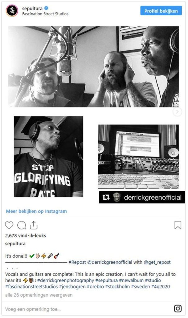 SEPULTURA frontman Derrick Green confirmed the end of the new LP’s recording sessions, writing on Instagram: