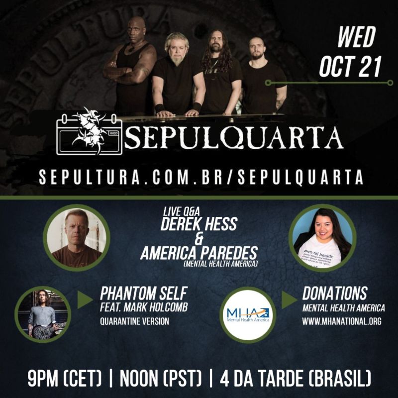 Dedicating this week’s ‘Sepulquarta’ session to Mental Health awareness, SEPULTURA welcomes the famous artist Derek Hess alongside America Paredes from Mental Health America for a chat. Derek Hess made his mark by creating an own unique style of work making strong connections in the music world whereas Mental Health America is the United States’ leading community-based nonprofit dedicated to addressing the needs of those living with mental illness and promoting the overall mental health of all. In a Q&A, they will explore the critical questions about mental illness that exists in the music industry and how it ties into even broader issues such as depression, anxiety, and sucide.Derrick Green comments: “Many may easily dismiss the idea of depression and anxiety with the idea that everyone feels sad, moody or low at times. However, depression and anxiety can develop into serious illnesses which impact upon both the physical and mental health of an individual and those around them.”
